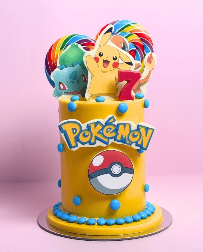 Key elements such as Pikachu’s head protruding from an otherwise traditional tiered cake